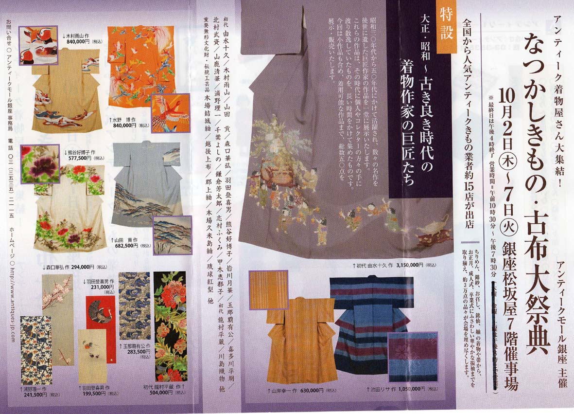 今、現座松坂屋ではアンティークきもの屋さんが大集結!して、なつかしきもの・古布大祭典がひらかれています