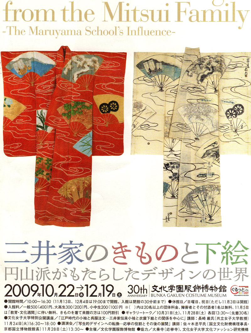 刺繍(ししゅう)や絞り染(ぞめ)、摺(す)り箔(はく)などの技法を駆使した豪華な着物は、保存状態も抜群に良い。流行をリードする立場にあった三井家ならではのデザインが楽しめる。このデザイン力の魅力に迫る上で見逃せないのが、会場内に合わせて展示される原寸大、かつ着物と同じ形状をなす下絵の数々。筆の運びや、三次元的な空間表現など、下絵とはいえ見どころが多い。写生を重視した江戸時代の絵師、円山応挙を祖とする円山派の影響が認められるというのもうなずける。 (新聞記事より抜粋)