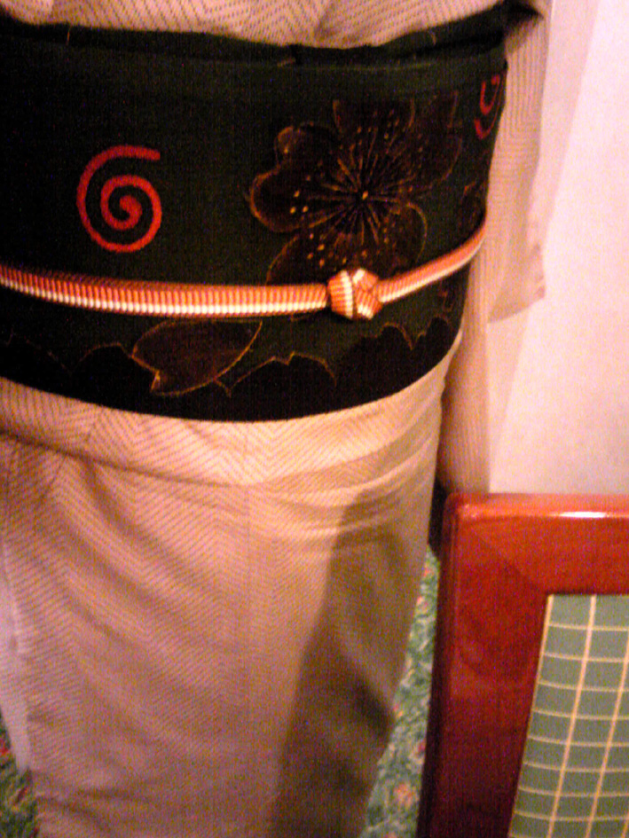 さて、夜のコーディネートは大島紬に茶色地の桜柄の染め帯