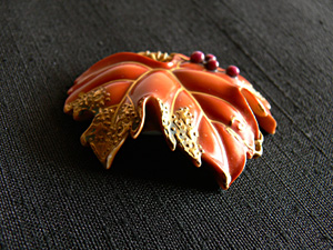 深いオレンジの葉っぱの上には、赤紫の実が四っつ! 葉脈と朽ちた風合いに見せている葉の一部は金加工されていて・・・とてもボリュームのある、豪華な感じ・・・