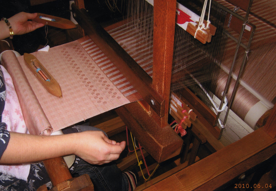 2色使いの糸で細かな市松模様に織り込まれて、そこに桜の花織が並んでいます