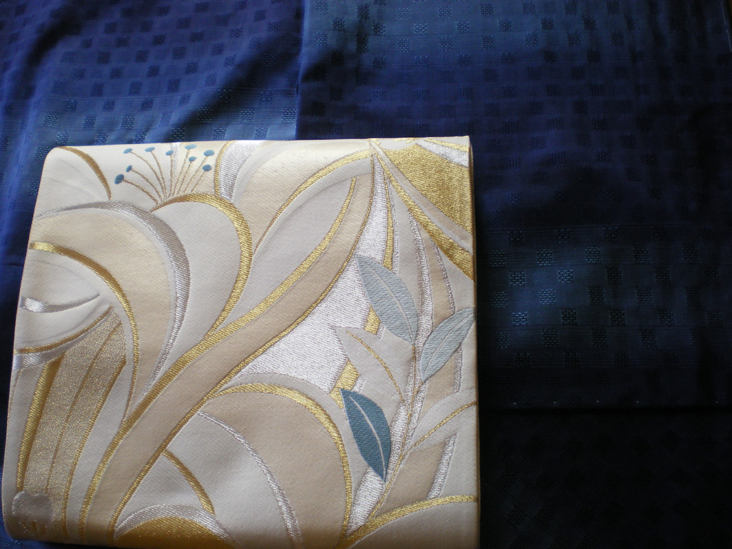 写真の藍の浮織りの着物と百合の袋帯