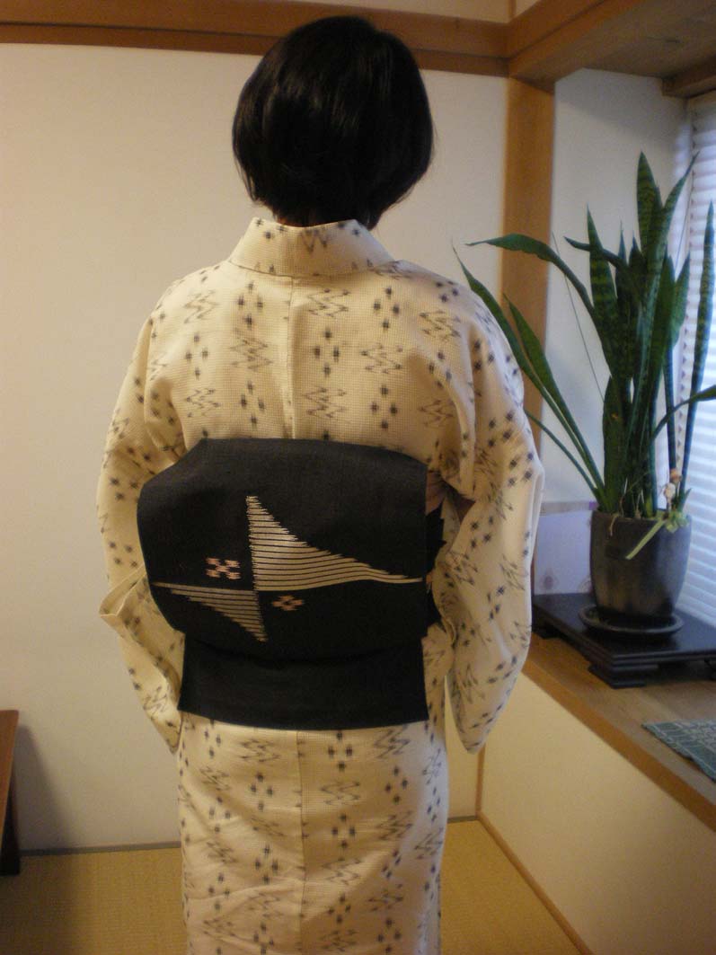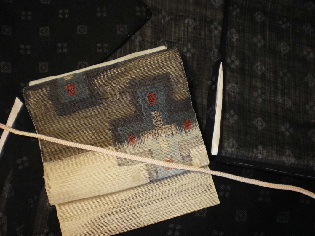 このお着物に赤系の帯を締めていたようですが、今回は麻の黒地の帯ですっきりと
