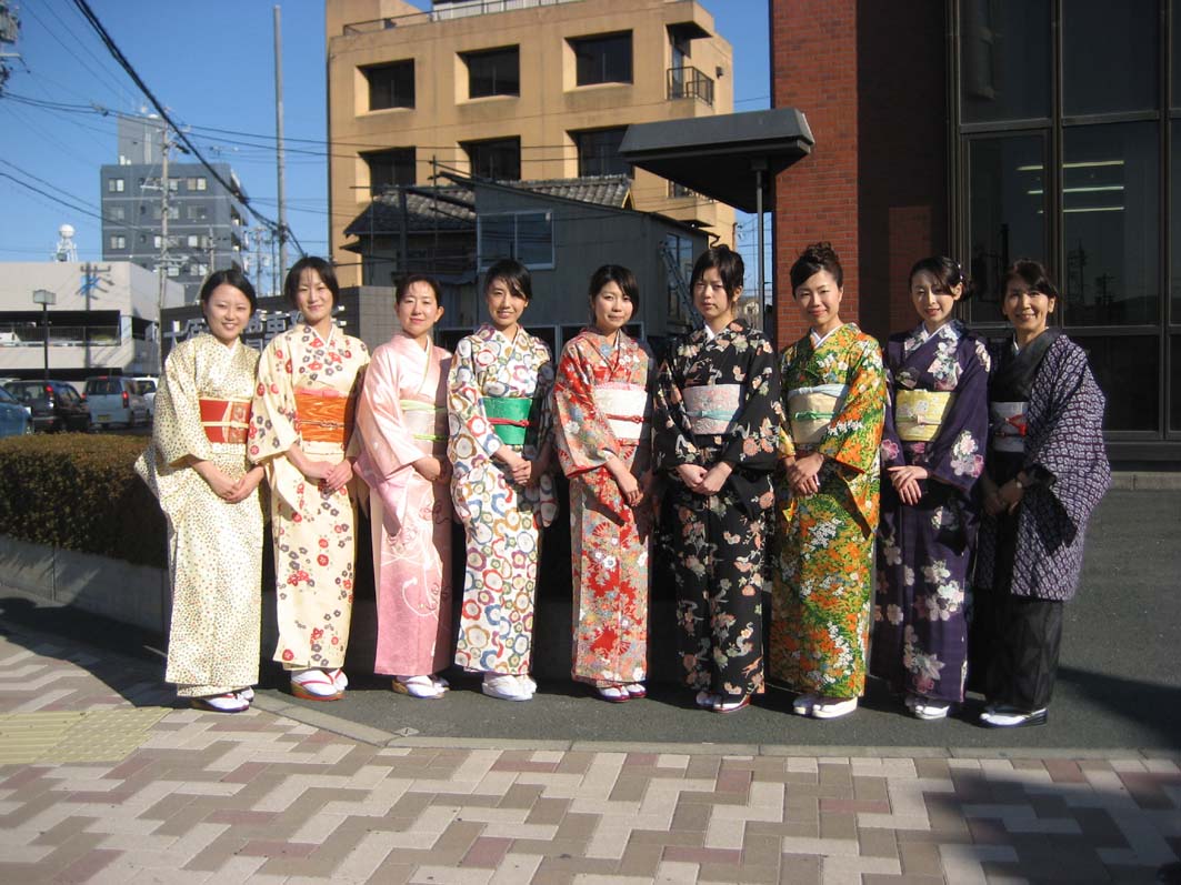 今年のお正月、某事務所の前での晴れ着姿の面々です!