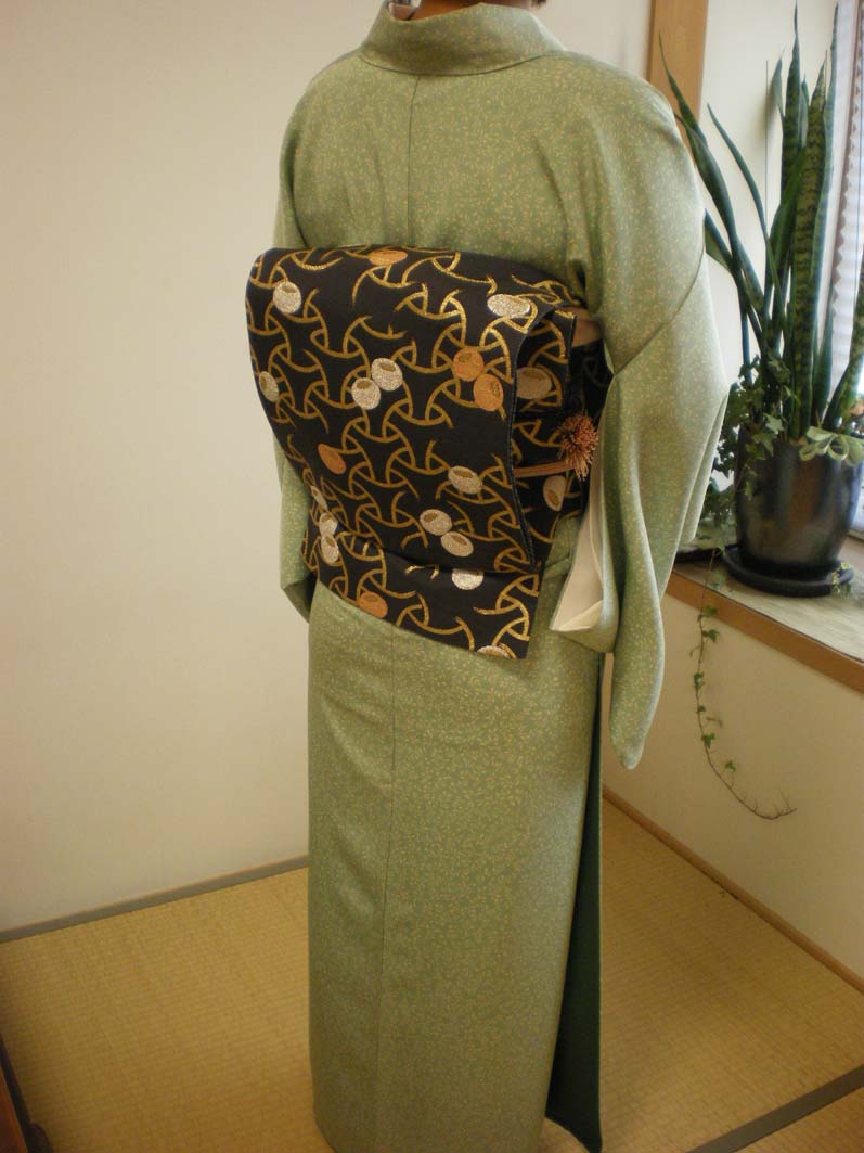 そして今回、とある呉服店で求めた、この春色のうす緑の小紋にのせて見ることに