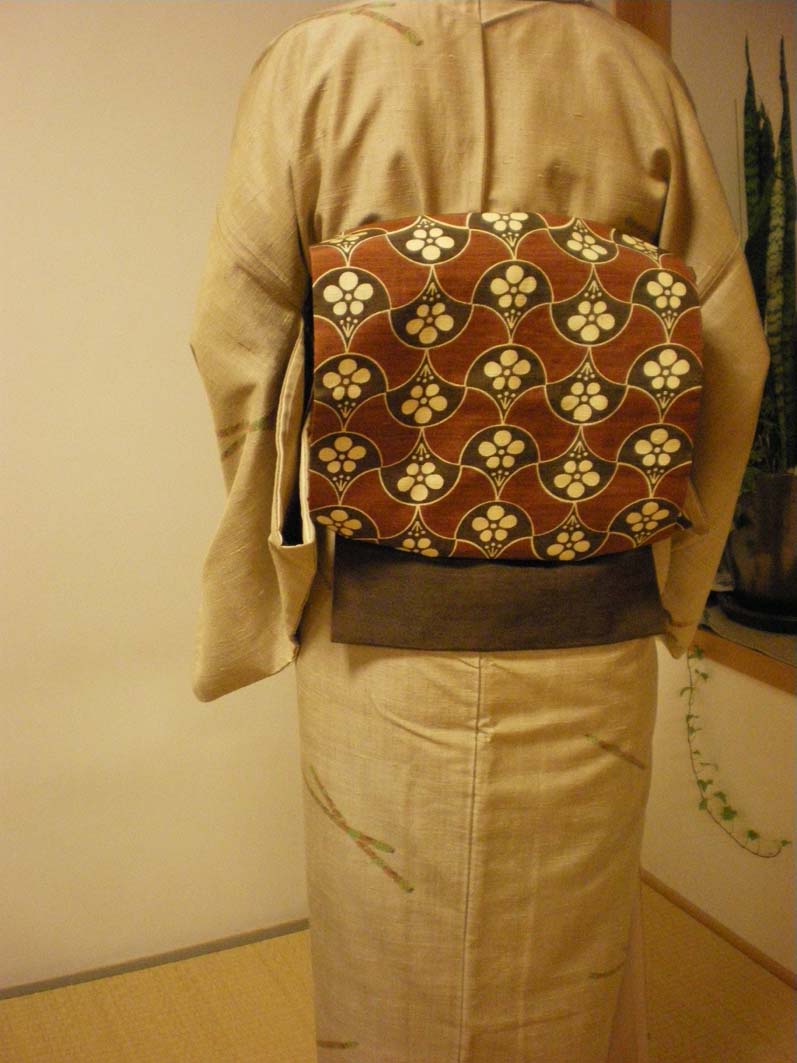 これに、型染めのイチョウに梅鉢?の、こげ茶の濃淡の紬帯を締めれば、冬バージョンのコーディネートの完成です!