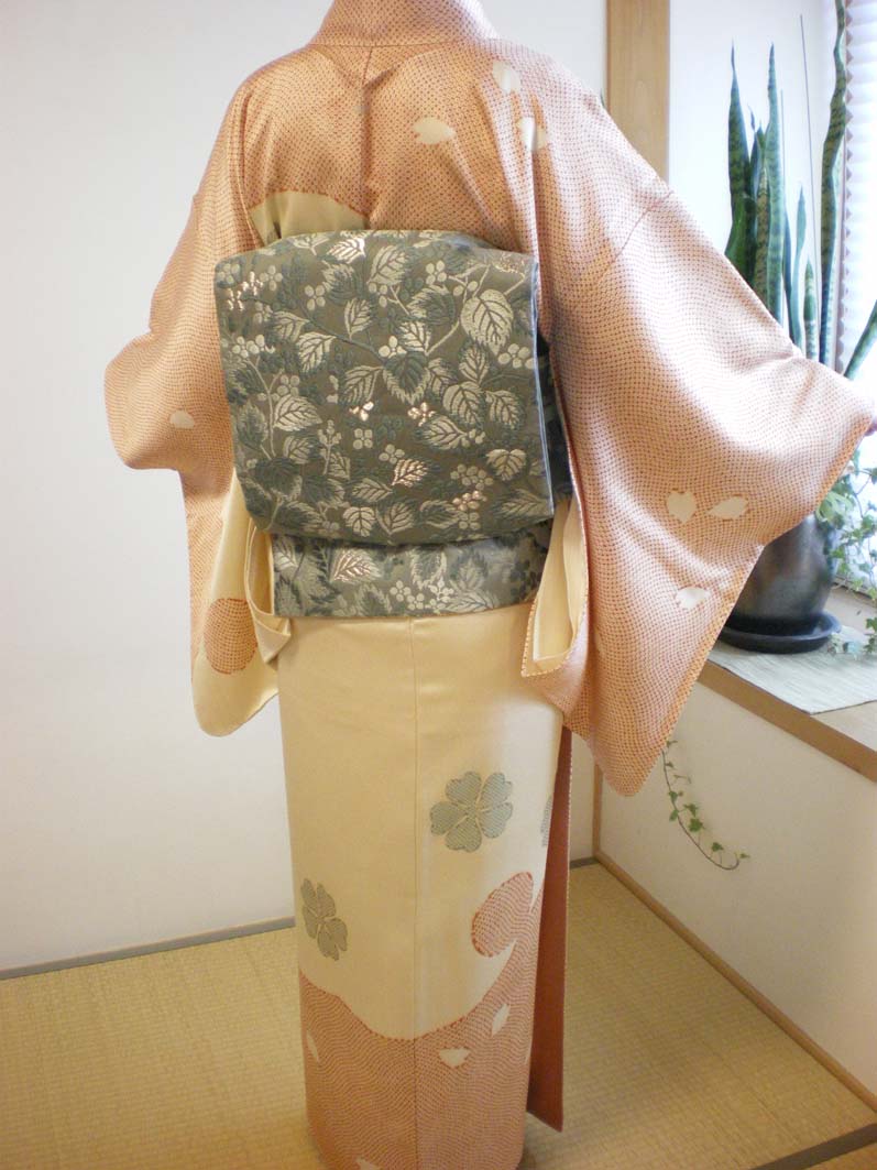 過日、そのお着物を持って、こちらの帯と、黒地の帯を乗せて見て、実際に着てみると・・・
