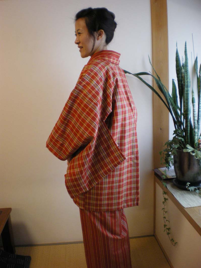 一見、普通のアンサンブルのようですが、実は羽織はチェックで、着物は縞模様になっています!