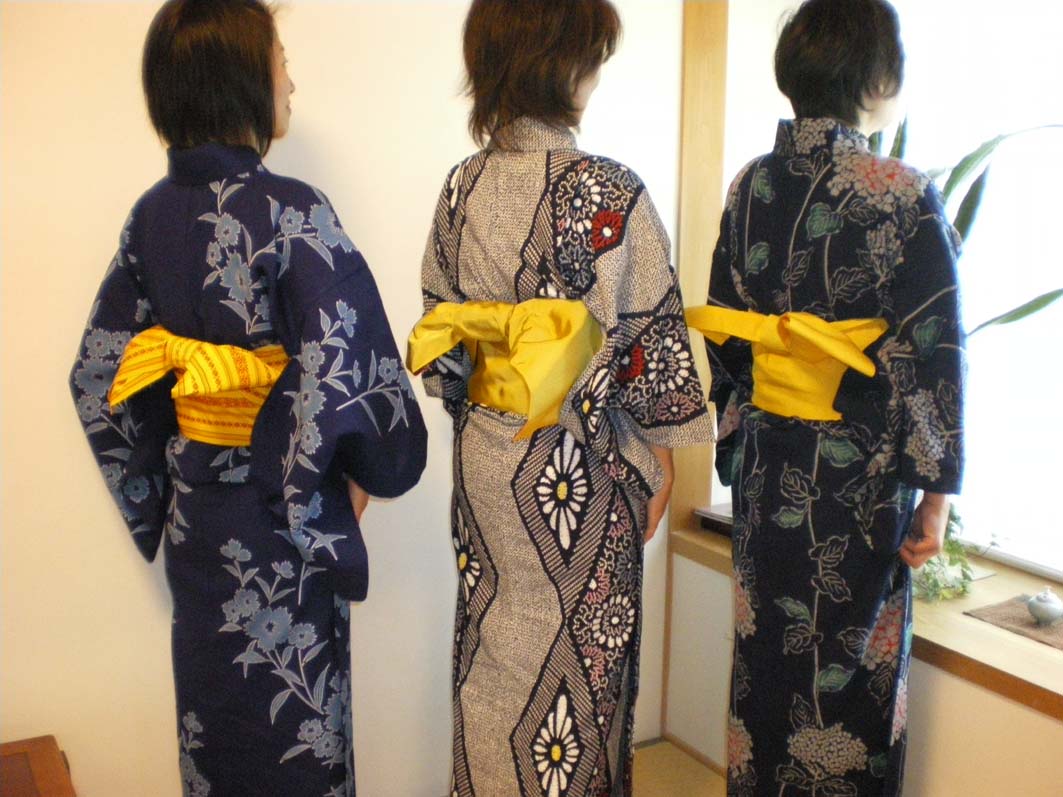 お二人は定番の4寸巾のもの、真ん中の方の帯巾は(たぶんご祖母様のもの?)、6寸近くあるのですが、丈が短いので、方流しのような結び方に