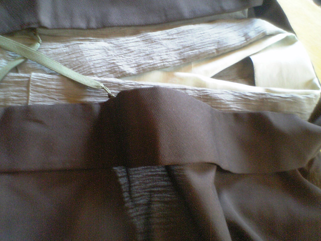 オリーブグリーンの麻の小千谷縮みの着物に、焦げ茶の、変わり織の紗の羽織