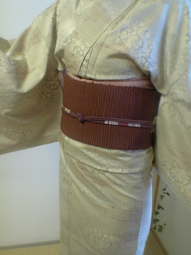 こんな着物に、モダンな赤茶の縞柄の帯を合わせてみました