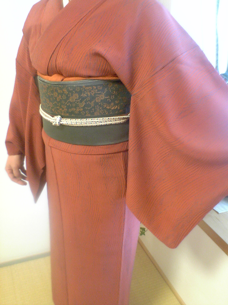 写真は、板締め絞りと思われる、レンガ色のお着物に、先日紹介しました、博多の紋織りの帯とのコーディネートを